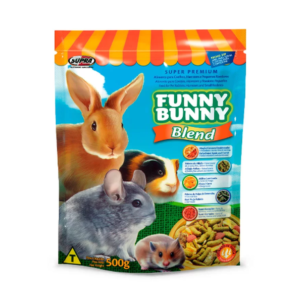 A Ração Supra Funny Bunny Blend Coelhos e Pequenos Roedores é um alimento exclusivo para coelhos de estimação e pequenos roedores. Possui fontes de fibras como alfafa peletizada e polpa de beterraba, milho laminado como fonte de energia, maça e cenoura desidratada como fonte de antioxidantes e vitaminas, além de Nutricomplex como fonte de minerais e aminoácidos.