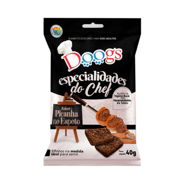 O Petisco Doogs Especialidades do Chef Picanha para Cães é um alimento específico para cães, que atua auxiliando na higiene bucal, diminuindo o acúmulo de alimento nos dentes. Produzido com ingredientes selecionados de alta qualidade, ele não possui transgênico e corante, além de ter um delicioso sabor de picanha.
