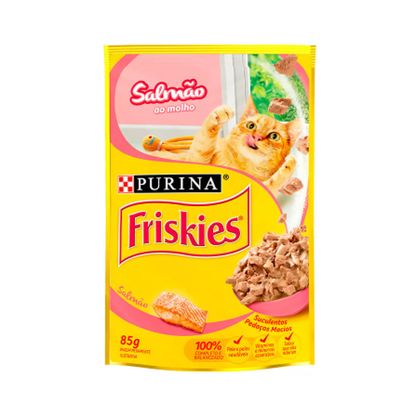 Salmão, fígado de frango, fígado suíno, miúdos de suínos, glúten de trigo, proteína concentrada de soja, carcaça de frango, amido de milho, dextrose, cloreto de sódio (sal comum), fosfato bicálcico, cloreto de potássio, carbonato de cálcio, água, taurina, glicina, vitaminas (A, D3, E, K3, B12, mononitrato de tiamina, suplemento de riboflavina, cloridrato de piridoxina, niacina, biotina, ácido fólico, pantotenato de cálcio, cloreto de colina), minerais (sulfato de zinco, proteinato de zinco, sulfato ferroso, sulfato de cobre, proteinato de cobre, sulfato de manganês, proteinato de manganês, iodato de cálcio, selenito de sódio), corantes (vermelho 3, óxido de ferro amarelo e dióxido de titânio)