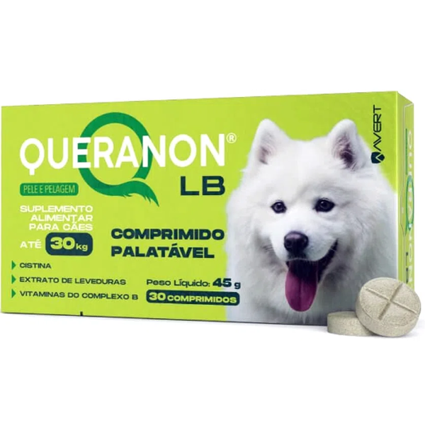 O Suplemento Queranon LB para Cães Até 30 kg Avert contém uma formulação exclusiva para pele e pelagem. Ricos em nutrientes específicos para melhorar o brilho, maciez e qualidade do pelo de cães.